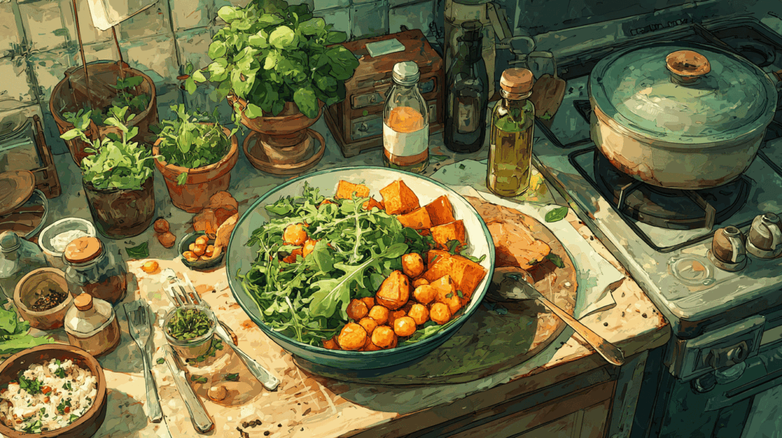 1. Ingredientes: – 2 xícaras de rúcula – 1 xícara de grão-de-bico assado – 1 batata-doce cortada em fatias finas (para fazer chips) – 2 colheres de sopa de tahine – Suco de 1 limão – Sal e pimenta a gosto