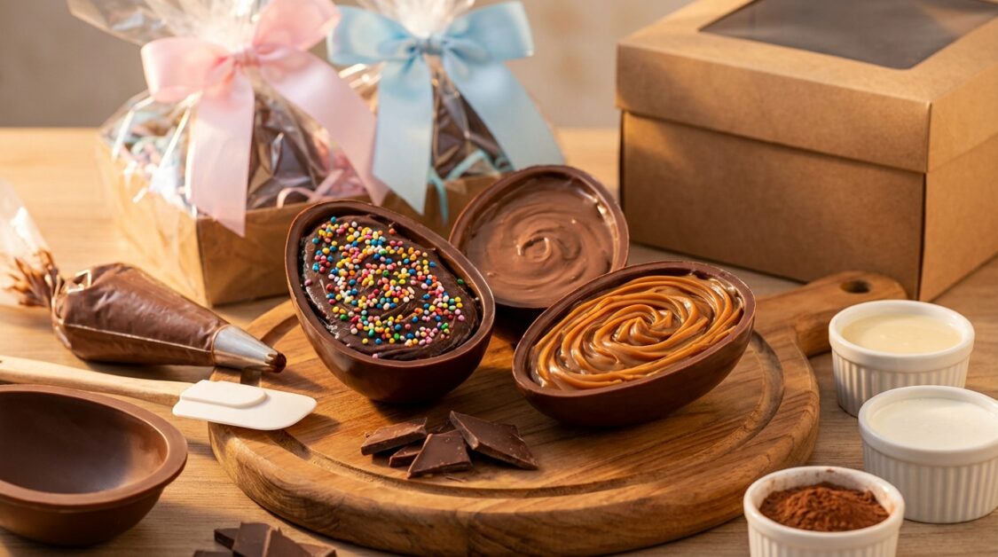 Equipamentos básicos: – Forma para ovo (plástico rígido ou silicone) no tamanho desejado – Espátula e colher – Tigelas refratárias – Pincel culinário (opcional, mas útil para espalhar a camada interna) – Termômetro culinário (opcional; facilita a temperagem correta) – Filme plástico, papel manteiga – Panela para banho-maria ou micro-ondas – Geladeira ou freezer para firmar as cascas