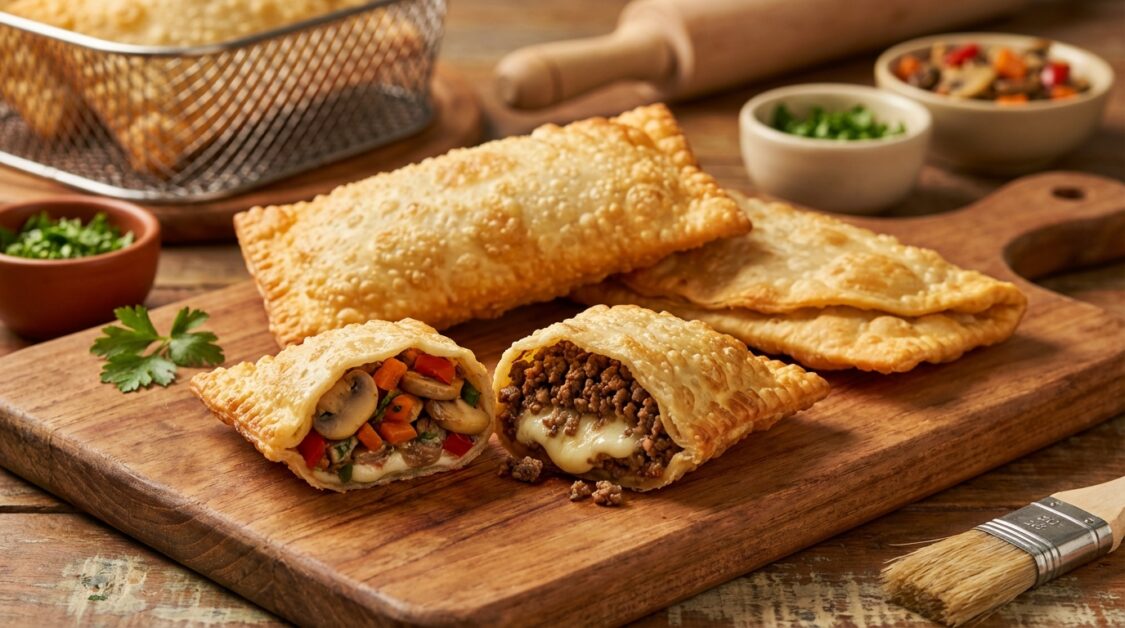 – Air fryer – Rolo de massa (ou garfo/garrafa se não tiver) – Tigela para massa – Frigideira para refogar recheios – Pincel de cozinha – Cortador (prato pequeno ou disco) ou faca